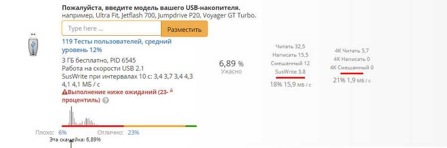 Следующий компонент – флешка. Её производительность оценена бенчмарк-сервисом низко – 6,89%. Флешка не участвует в формировании общей оценки системы, её оценка является просто информацией к сведению. Низкая оценка флешки обусловлена её подключением к порту USB 2.0.
