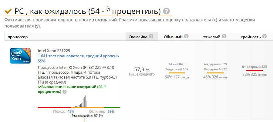 Наш процессор в отдельности набрал 57,3%, собственно, что и повлияло на относительно хорошую оценку в общем. Для устаревшего процессора Sandy Bridge, а этой микроархитектуре, на минуточку, в следующем году исполнится 10 лет, на фоне современных процессорных мощностей — это реально замечательный результат.