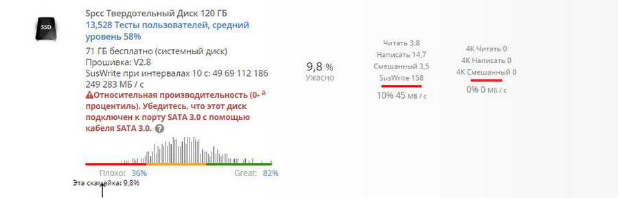 А вот это уже, судя по результатам тестов чтения и записи данных, проведённых при тестировании компьютера, является сбоем со стороны софта UserBenchmark. Программа просто по какой-то причине не смогла провести нужные тесты и влепила диску критически низкую оценку
