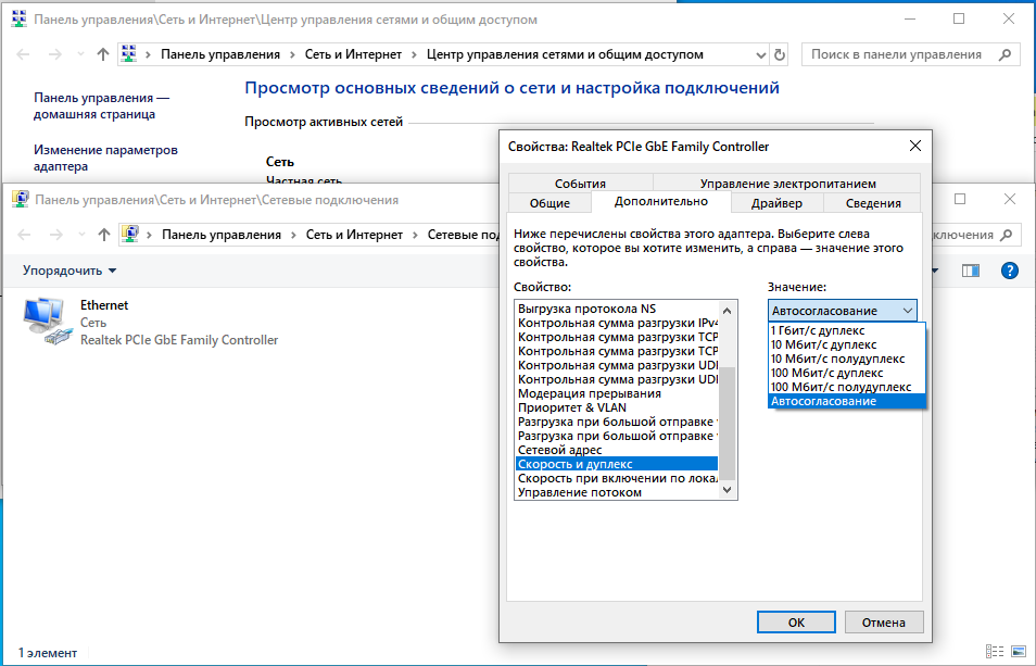 - Ограничения на сетевой карте. В изменениях параметров адаптера в настройках активного подключения можно проверить и изменить скорость и дуплекс. Она может быть автоматической или ограниченной по желанию.