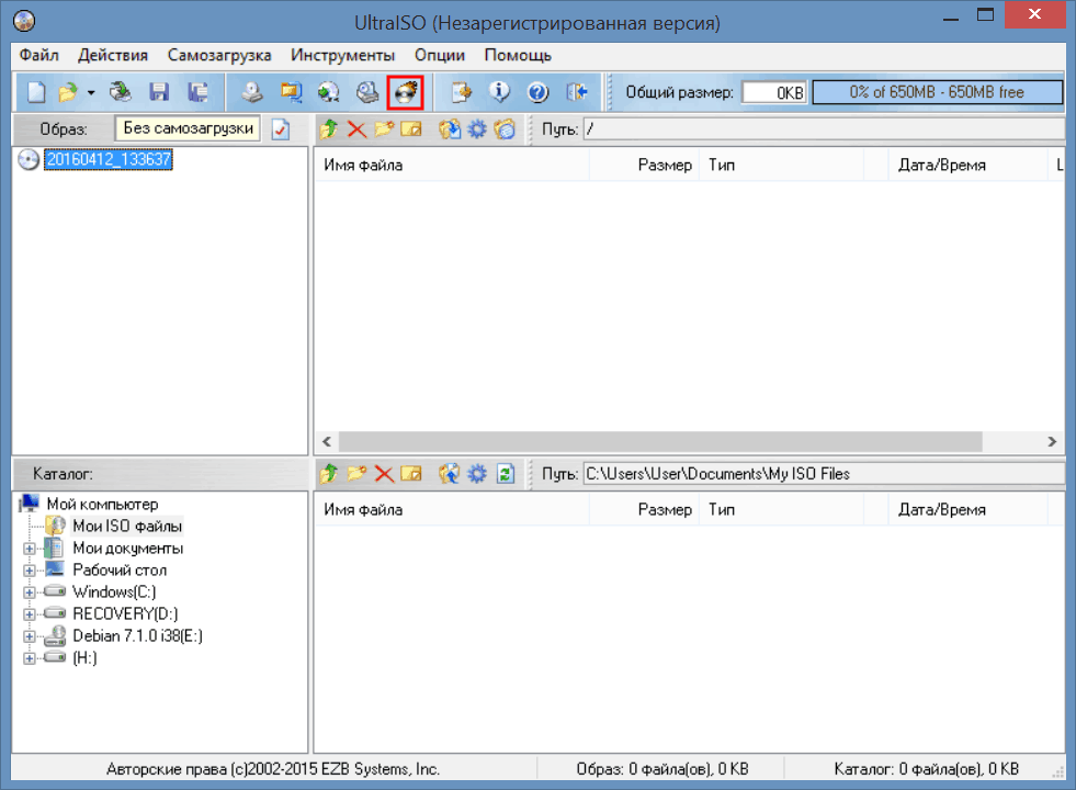 В результате откроется главное окно программы. Для того, чтобы приступить к записи образа на диск следует нажать на кнопку с горящим диском на панели инструментов.