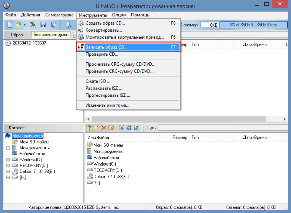 Также вы можете воспользоваться пунктом меню «Инструменты» под названием «Записать образ CD»