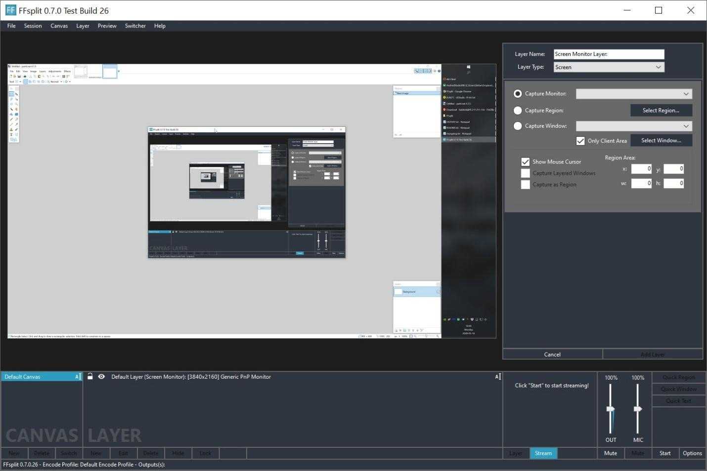 Последний софт для стриминга, о котором я расскажу – это FFSplit. Он был создан специально для проведения стримов и прямых эфиров. В приложении можно вручную выбрать разрешение и качество изображения, настроить битрейт и подключить несколько источников одновременно. Созданные видеозаписи можно объединить в один проект и отправить напрямую в сеть или сохранить на локальный диск в формате MP4, MKV, FLV.