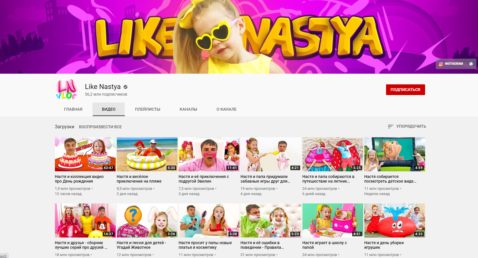 Like Nastya прославилась обзорами на парки аттракционов. Когда она набрала несколько миллионов на канале, стала заниматься обзорами и распаковками игрушек (реклама – дело просматриваемое и прибыльное).