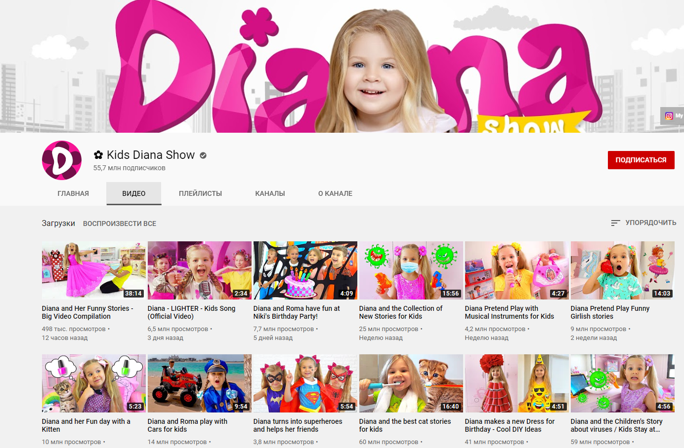 Диана с Kids Diana Show регулярно рассказывает подписчикам о своих историях, можно сказать, что это её фишка. 55,6 миллионов подписчиков следят за новыми скетчами и приключениями девочки.