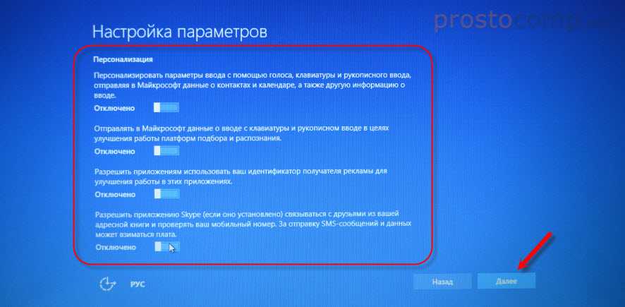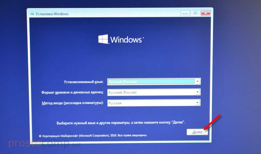 По умолчанию, обычно уже показывается все с русскими настройками, если нет, выбираем нужный язык и страну, нажимаем на кнопку “Далее”.