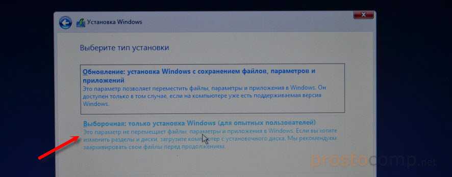 Здесь важно выбрать второй пункт «Выборочная — установка Windows для опытных пользователей«