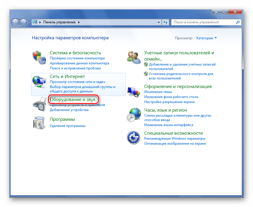 В Панели управления находим раздел «Оборудование и звук» и перемещаемся в него для совершения дальнейших действий.