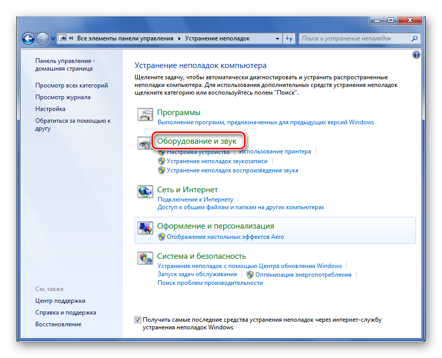 В окне Мастера устранения неполадок перемещаемся в интересующую нас сейчас категорию «Оборудование и звук».