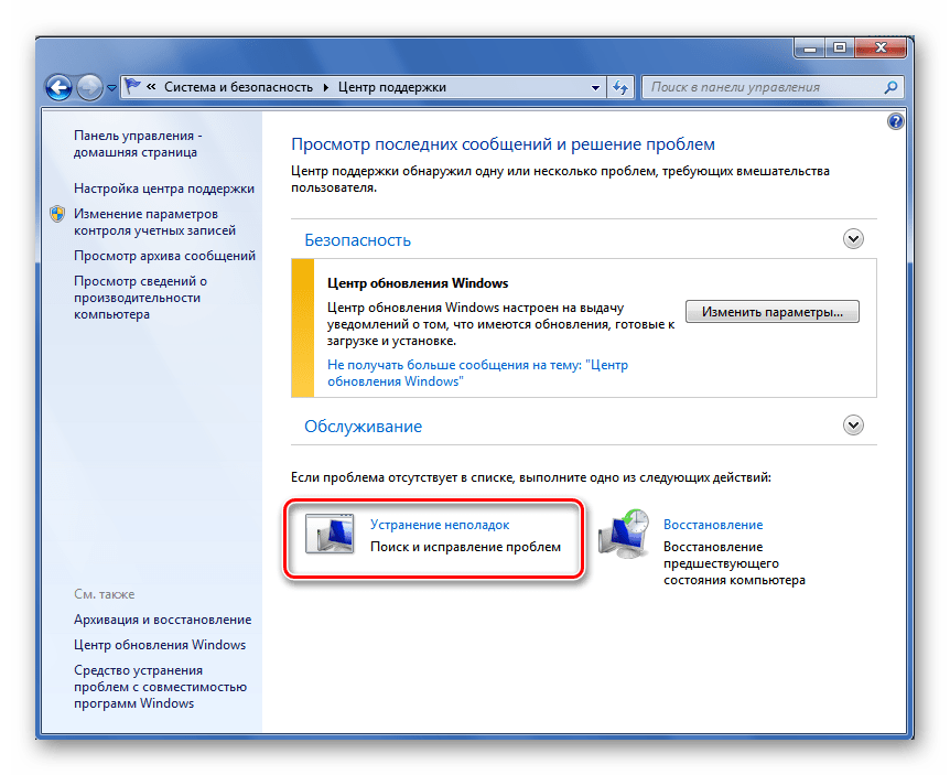 Здесь для поиска и исправления возникших проблем открываем блок устранения неполадок.