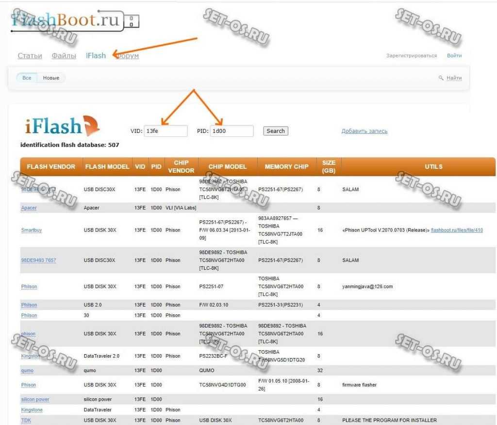 Вбиваем значение VID и PID в соответствующие поля поиска и нажимаем на кнопку Search. В найденных результатах ищем свою модель флешки и предлагаемые для неё утилиты, ссылка для скачивания которой обычно там же и присутствует.