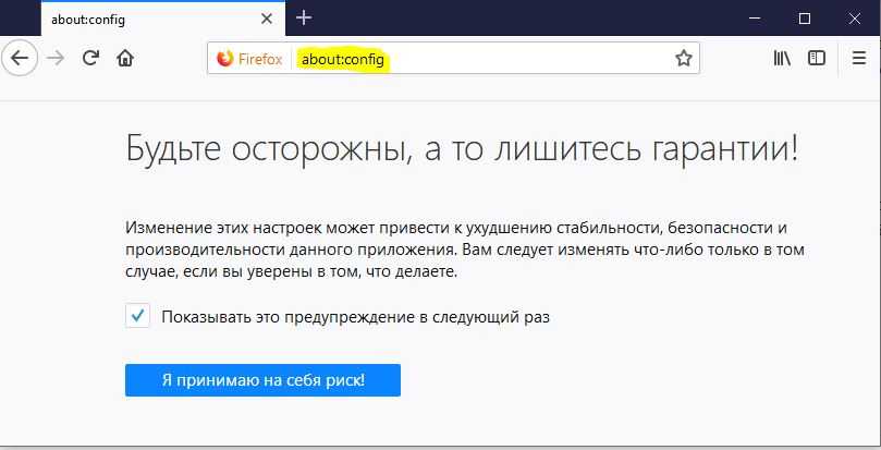 - Firefox предупредит вас, что изменение этих настроек может повлиять на производительность и безопасность. Чтобы продолжить, нажмите кнопку «Принять риск и продолжить».