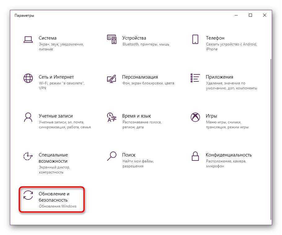 В открывшемся окне перейдите в раздел «Обновление и безопасность».
