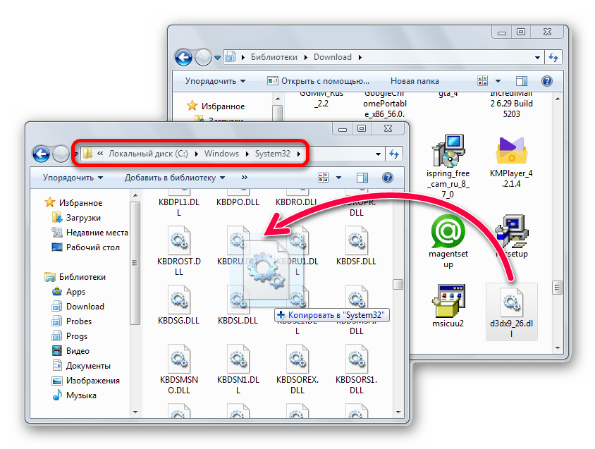 Вы можете установить DLL сами, используя стандартные функции Windows. Это актуально, если проблемы наблюдаются только с одним файлом и хочется быстро восстановить его работоспособность. Для этого понадобится вначале ее скачать и произвести копирование загруженного файла в системную директорию . Обладателям 64-битной операционной системы также нужно положить его копию в .