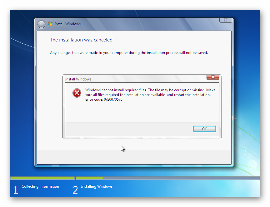 Непосредственной причиной 0x80070570 является то, что при инсталляции системы не выходит переместить все необходимые файлы с дистрибутива на винчестер. Существует несколько факторов, которые могут привести к этому: