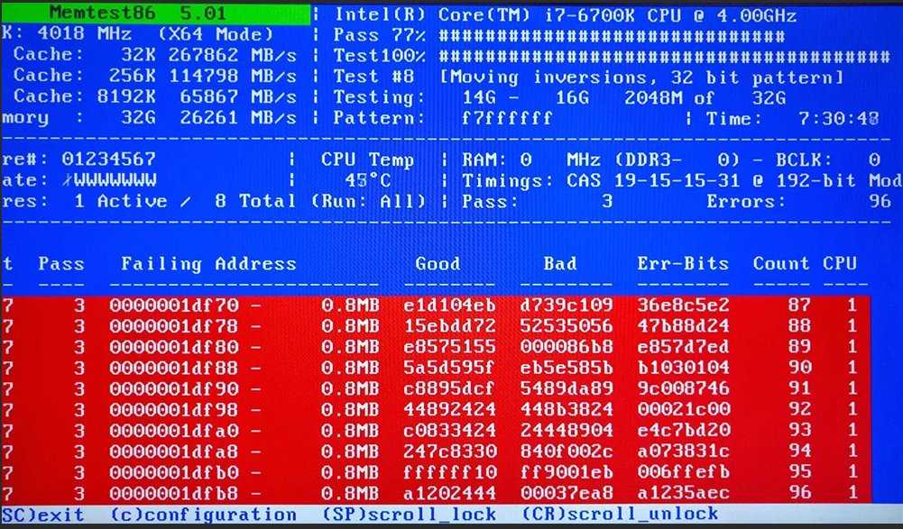 Сразу после запуска Memtest начнёт проверять оперативную память, выделяя ошибки красным. Если же ошибок обнаружено не было, значит, проблема в контактах.