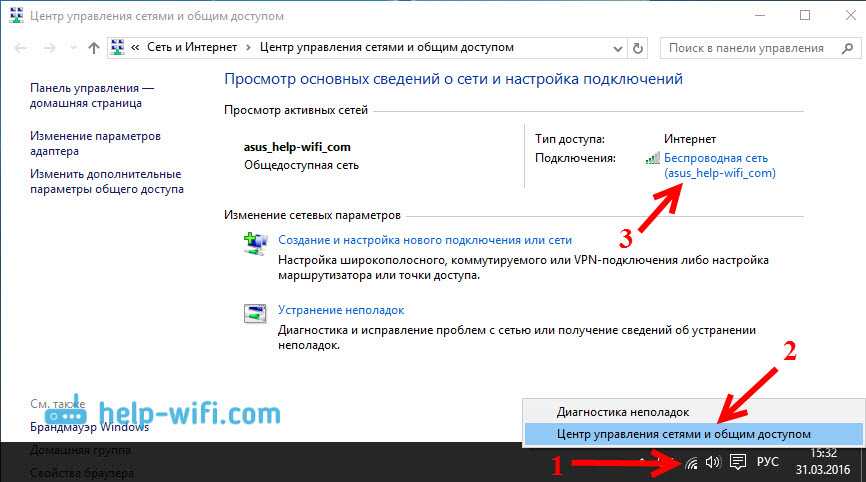 Нажмите правой кнопкой мыши на значок интернет соединения и выберите Центр управления сетями и общим доступом.