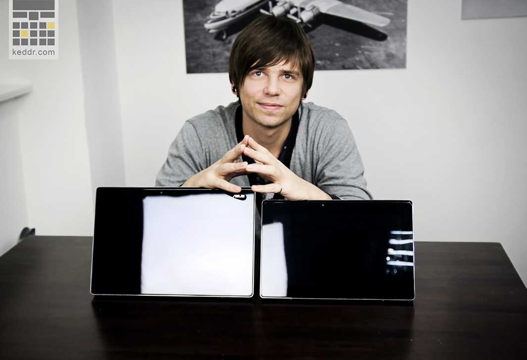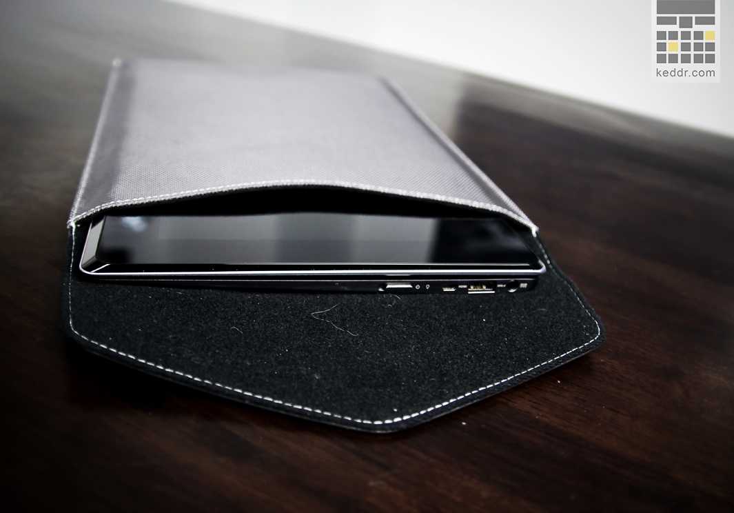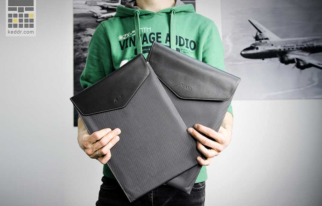 Вы же все поняли? На мой взгляд, размещение дисплея сзади — это удивительно и поначалу непривычно. Сразу возникает мысль, что экран на крышке будет царапаться и это все плохо закончится. Но переживать не о чем. Во-первых, экран покрыт защитным стеклом, во-вторых, в комплекте идет чехол в лучших традициях Zenbook’ов. Вторая мысль о том, что это самый удачный форм-фактор, совмещающий в себе планшет и ультрабук. Идеи Lenovo, где дисплей крутится внутри одной рамки или гуттаперчевый Dell Yoga или даже идея разбирать с отверткой ваш девайс на две части (клавиатура и планшет) — все это мне не по душе. Lenovo таки потеряет где-то экран, йогу кто-то таки свернет бесповоротно, а в области соединения клавы и планшета во всевозможных трансформерах непременно облезет краска. Все это мои личные ощущения и фобии.