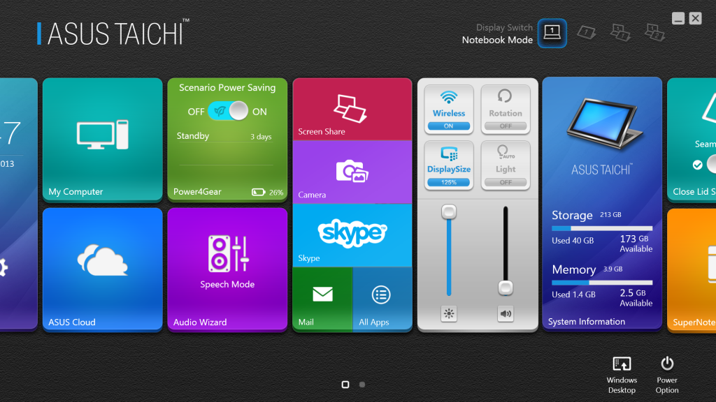 Как уже упоминалось, при нажатии на специальную синюю кнопку вызывается приложение Asus Taichi, в котором можно осуществить множество действий одним кликом. Это нейки аналог андроидной панели уведомлений, где есть настройки яркости, включение / выключение Wi-Fi, регулировка яркости и т.д. На одном из виджетов отображается информация о состоянии внутренней и оперативной памяти, на другом − дата и время, на третьем − переключатель режимов энергосбережения, можно запустить камеру, приложение SuperNote, Asus Cloud, Skype, камеру, почту и многое другое.