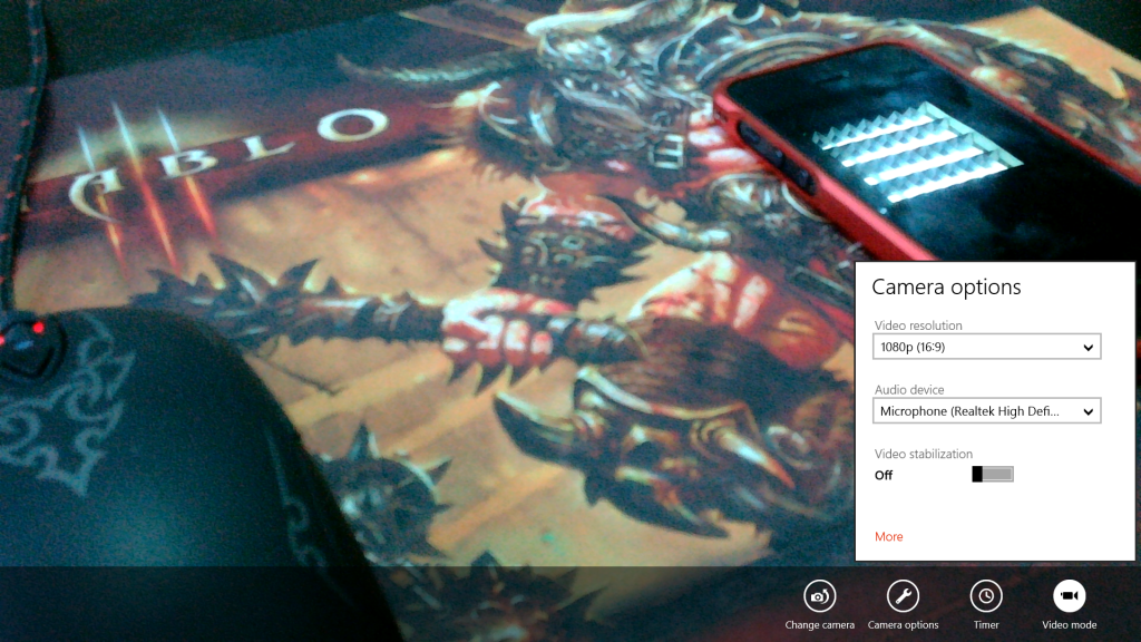 В Taichi есть две вэбкамеры. Первая, ноутбучная, обладает сенсором на 0,9 мегапикселей и может снимать видео в 720 р. Может, но не стоит этого делать − калейдоскоп из 90-ых и тот приятнее будет. А вот задняя вэбкамера, которая для планшетного варианта, очень даже ничего. Пятимегапиксельный сенсор может снимать видео вплоть до 1080 р. В настройках есть даже пункт стабилизации изображения, но все это пока баловство. В целом снимки получаются достойного качества и стоят на ряду с другими планшетами на Win8 или Android.