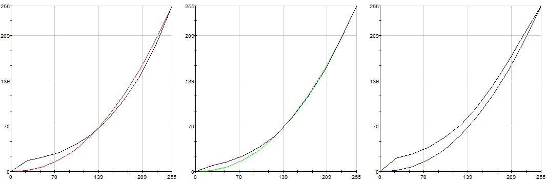 Гамма-кривые дисплея до калибровки (черные линии) в сравнении с идеальными (цветные линии)