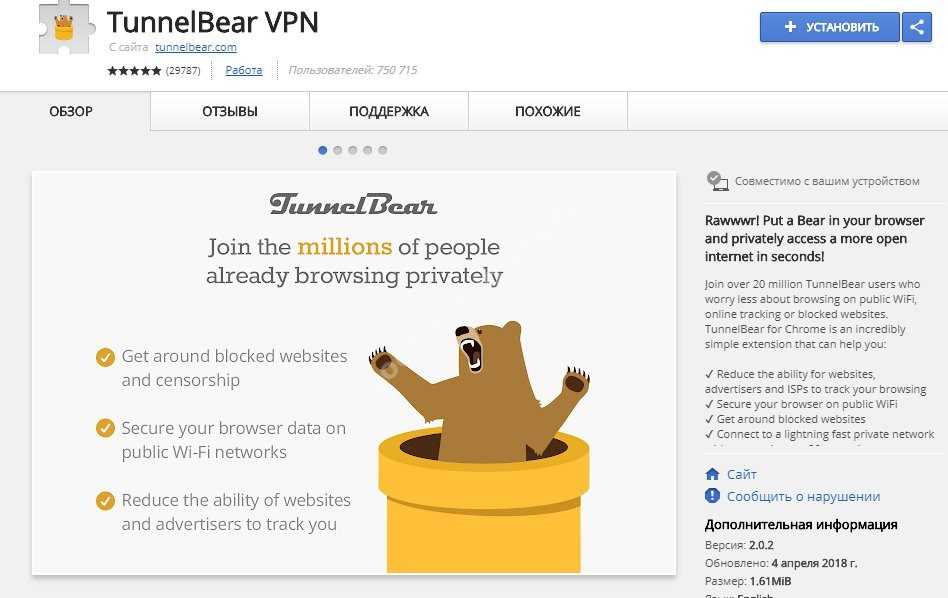 | 4. TunnelBear | Google Chrome, Opera, Mozilla Firefox | 500 Мбайт в день или от $3,33 в месяц |