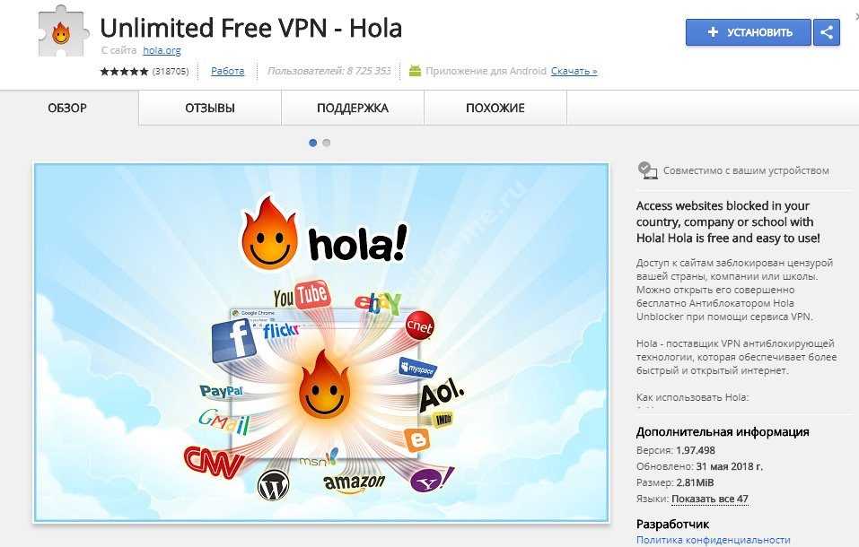 На четвертом месте всемирно распиаренный, но от того не менее функциональный сервис Hola. Доступен для любой платформы от банального Хрома, до телевизоров и игровых приставок. Выбираем наш «банальный» Chrome и устанавливаем расширение. Интерфейс приятен для пользования.