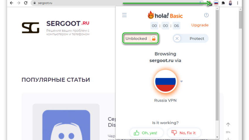 Подключается VPN также одним простым нажатием кнопки Unblocked.
