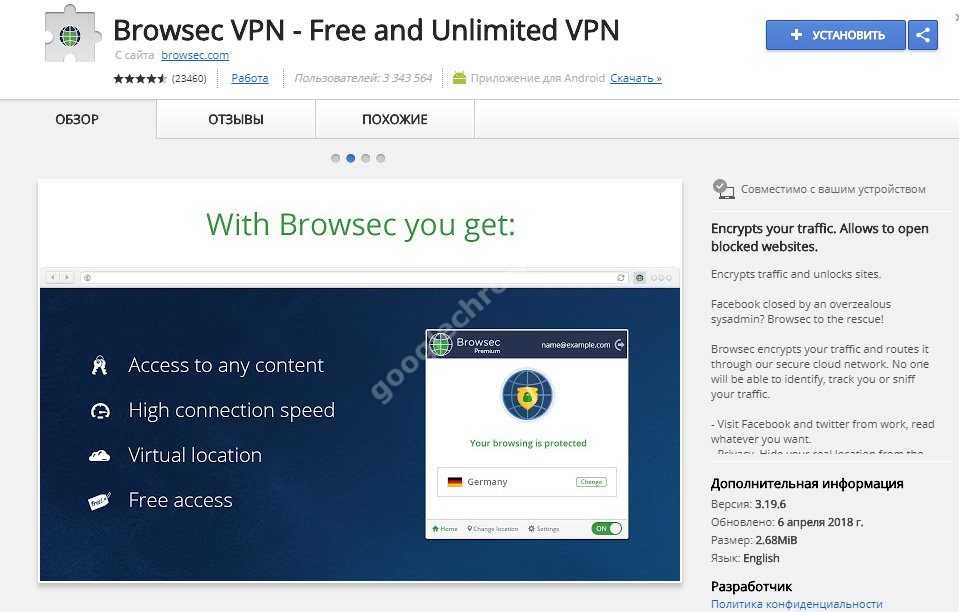Первое расширение для VPN в нашем списке, это Browseс. Довольно неплохое решение с неограниченным количеством трафика. Но скорость соединения страдает.