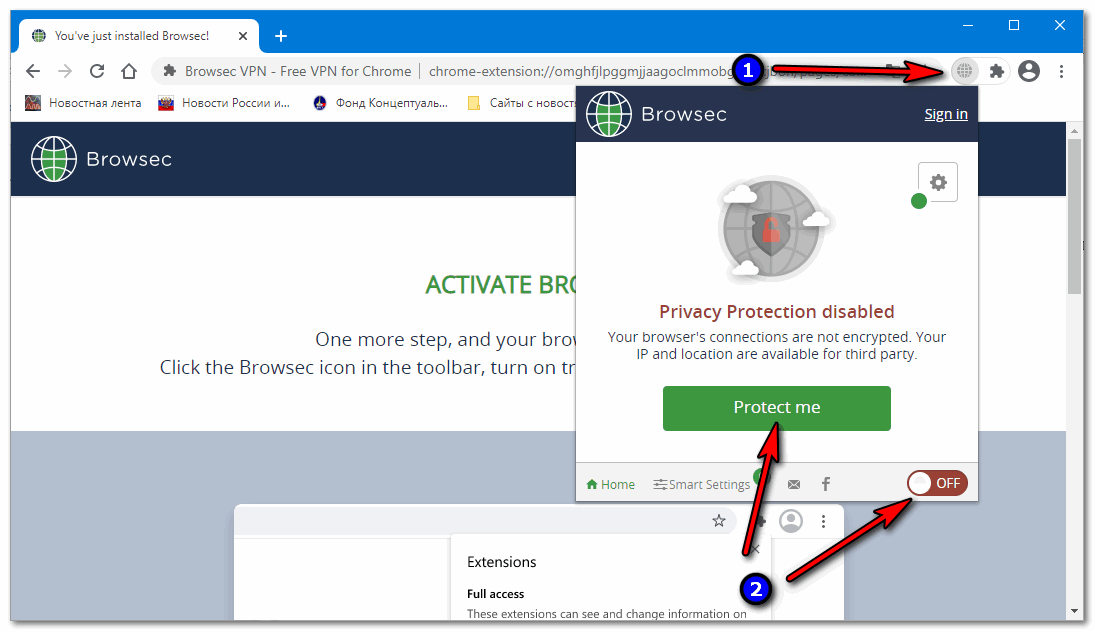 - Щёлкните по иконке дополнения, затем – по кнопке «OFF» либо «Protect me».