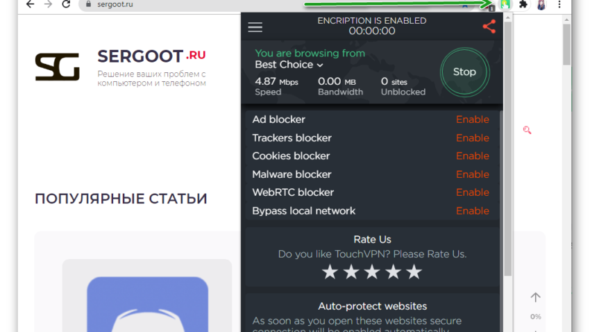 На пятом месте сервис TouchVPN со своими шестью тысячами серверами в 90 странах мира. Работает на всех основных платформах устанавливаем TouchVPN для нашего Chrome и при запуске сервис по умолчанию предлагает подключиться к самому быстрому серверу в вашем регионе.