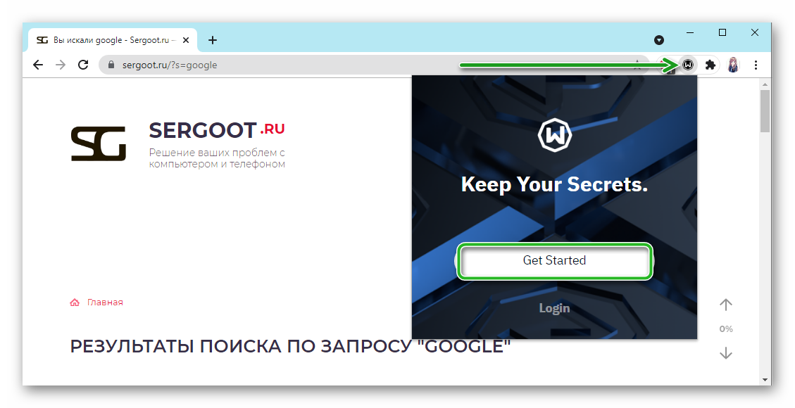 Устанавливаем его / кликаем по значку расширения и нажимаем кнопку Get Started.