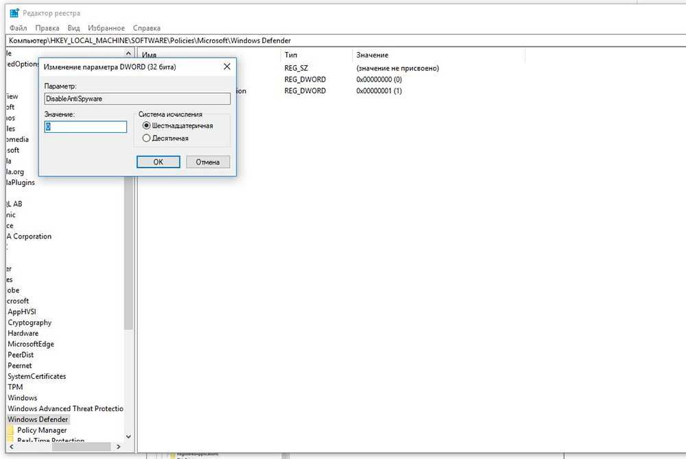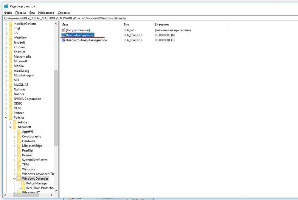 - отыскать «Disable AntiSpyware» и поменять Значение:1;