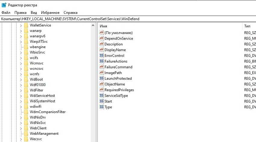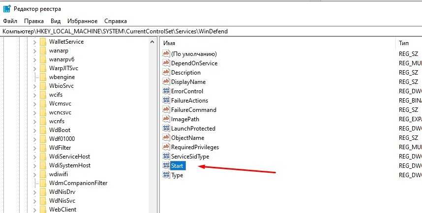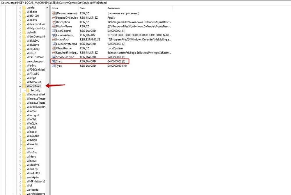 перейти в самый конец: HKEY_LOCAL_MACHINE\SYSTEM\CurrentControlSet\Services\WinDefend;
