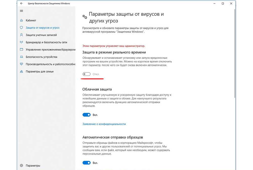 Там перейдите в раздел «Параметры защиты от вирусов и других угроз» и кликните по переключателю «Защита в режиме реального времени».