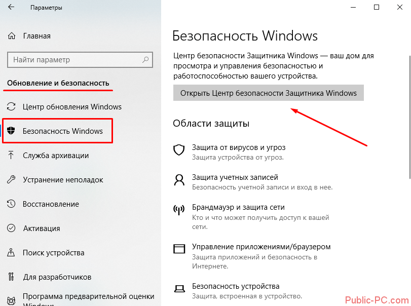 Этот способ позволит не полностью, но временно отключить Защитник. Заходим в параметры Windows комбинацией клавиш Win+I. Далее – раздел «Обновления и безопасность», затем вкладка «Безопасность Windows» — и кликаем на «Открыть Центр…».