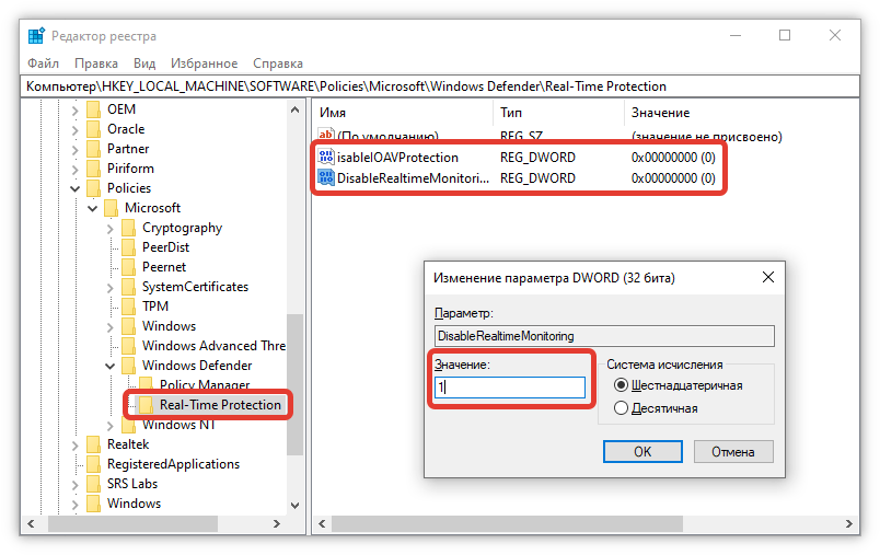 - создать еще два элемента DWORD32: «Disable IOAVProtection» (Значение:1) и «Disable RealtimeMonitoring» (Значение:1);