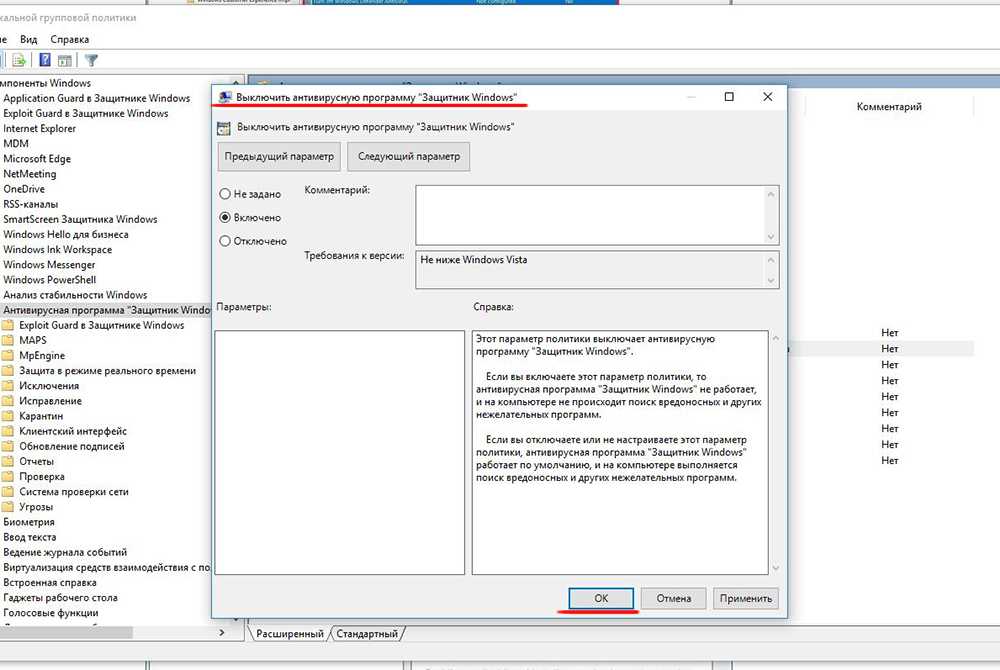 Закройте редактор групповой политики и можете, как и в первом способе, проверить отключился ли Defender.