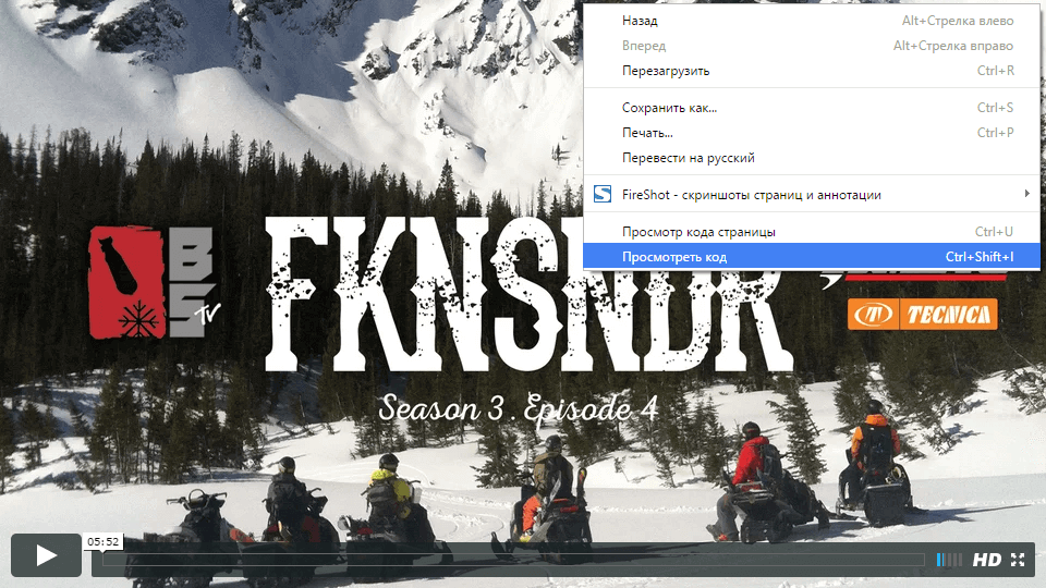 Открыв страницу с нужным видео, я незамедлительно кликнул правой кнопкой мыши по области видеоролика, где из контекстного меню выбрал пункт — просмотреть код.