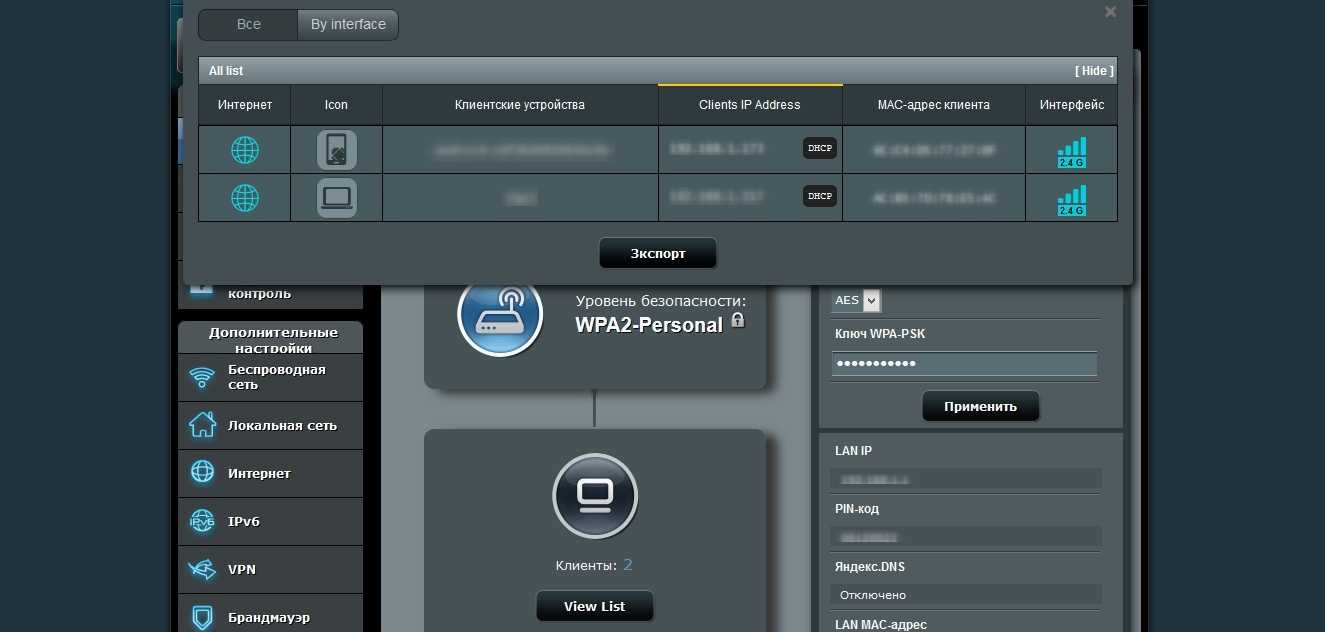 - В первой вкладке видим список подключенных к вайфай клиентов .