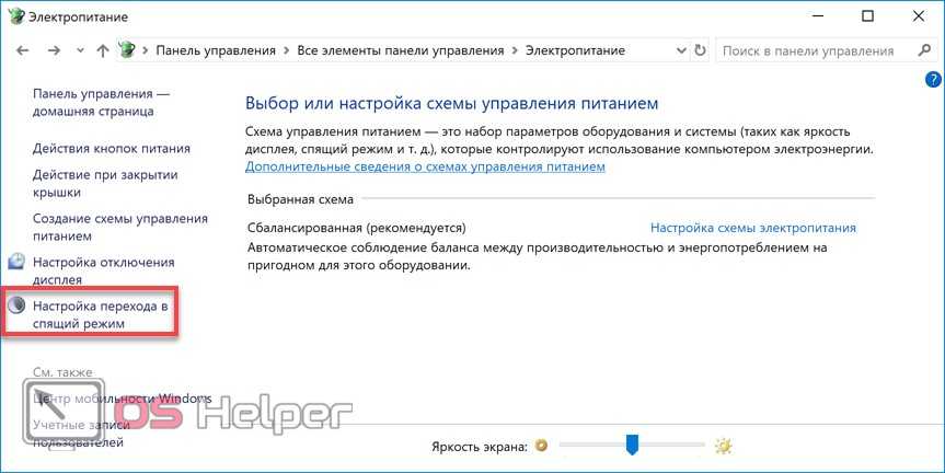 - В окне настроек электропитания, выберите опцию «Настройка перехода в спящий режим».
