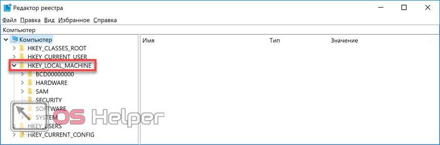 - Открывается редактор реестра. В левой части расположены «кусты», содержащие информацию. Нас интересует HKEY_LOCAL_MACHINE. Все данные о компьютере и его конфигурации собраны в нем.