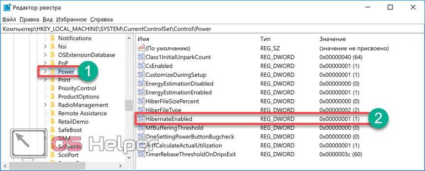 - Оказавшись в реестре, переходите по древу разделов до папки HKEY_LOCAL_MACHINE/System/CurrentControlSet/Control/Power. Отыщите в конечной папке элемент HibernateEnabled и установите ему значение 1 (единица), соответствующее включённому режиму гибернации. Для отключения режима установите этому же элементу значение 0 (ноль). Устанавливаем элементу HibernateEnabled значение 1