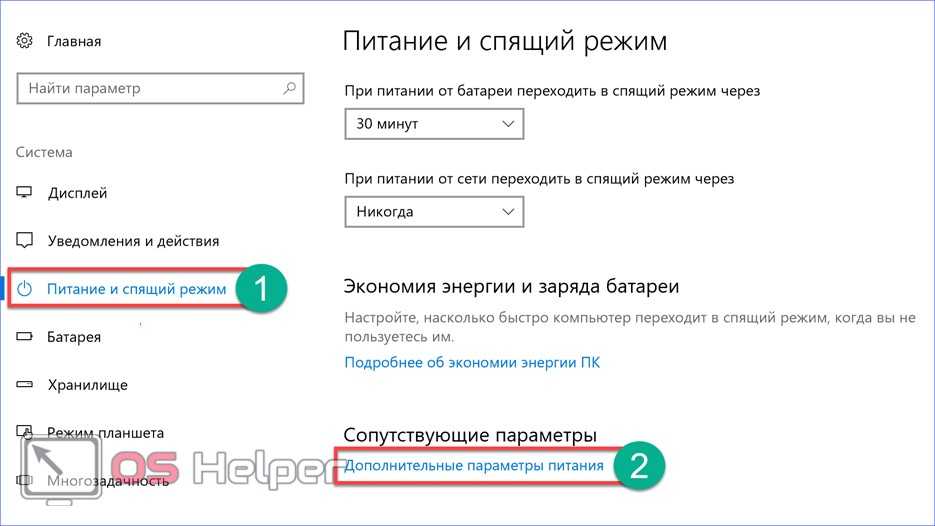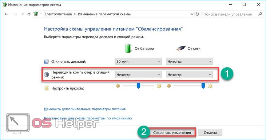 - Находят пункт «Спящий режим» и устанавливают ему параметр «Никогда».