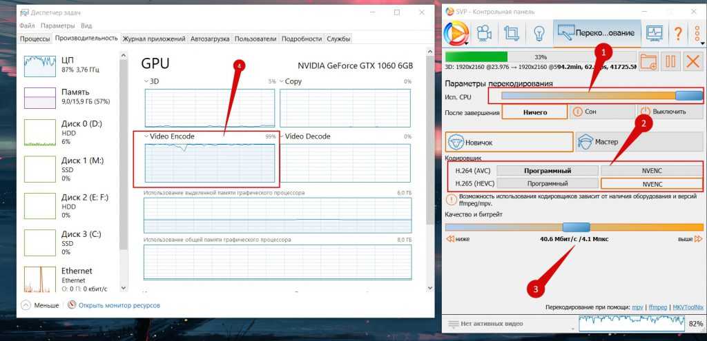 А 4 — это загрузка кодировщика видюхи, которую можно глянуть в Диспетчере Задач винды. Если она под сотку, как на скрине, значит, всё поставили правильно и фильм конвертится с максимальной доступной вам скоростью.