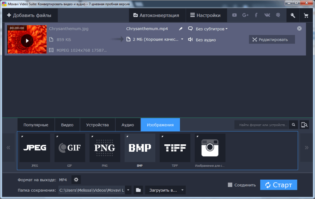 - Movavi работает с большинством популярных форматов (более 180): AVI, MOV, MKV, ACC, MP3, PNG, DVD, FLV, MXF, GIF, MKM, OGG, M4V, JPG и другими;