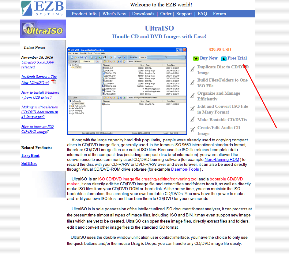 - Купите или скачайте пробную версию, которой вполне хватит для выполнения нашей задачи, с официального сайта разработчика: https://ezbsystems.com/ultraiso/.
