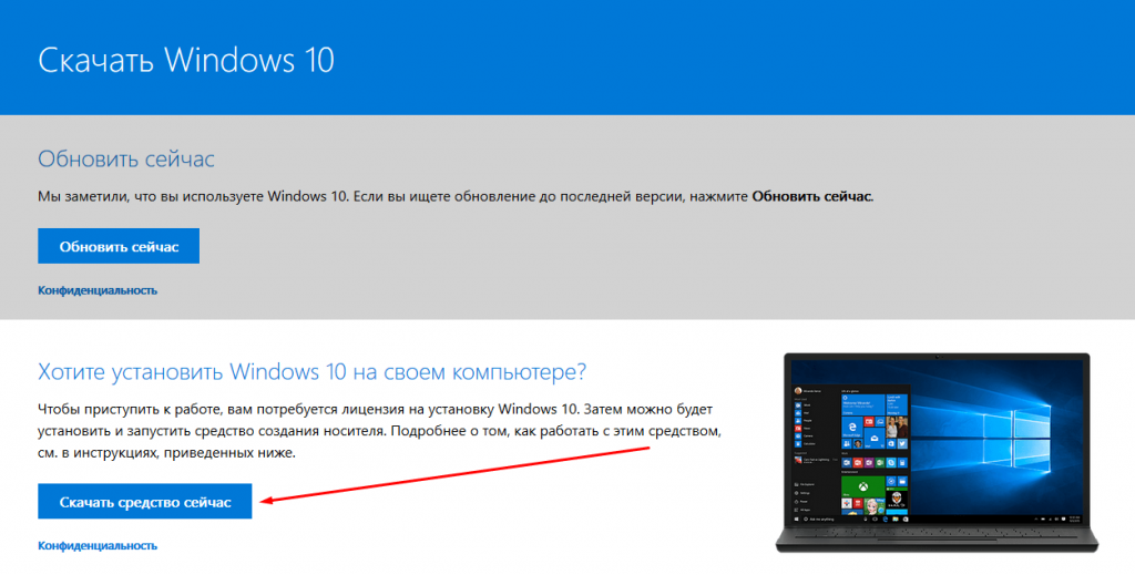 - Перейдите на официальную страницу Windows 10 и скачайте с неё установочную программу от Microsoft (https://www.microsoft.com/ru-ru/software-download/windows10).